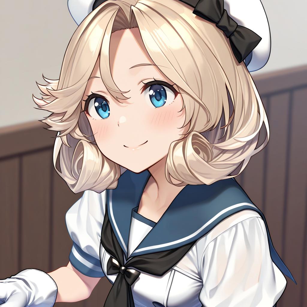 Janus (kancolle), kantai collection, 1girl, blue eyes, blonde hair, short hair, parted bangs, sailor hat, white gloves, sailor dress, white dress, white headwear, blue sailor collar, short sleeves, by artist baffu, illustrious