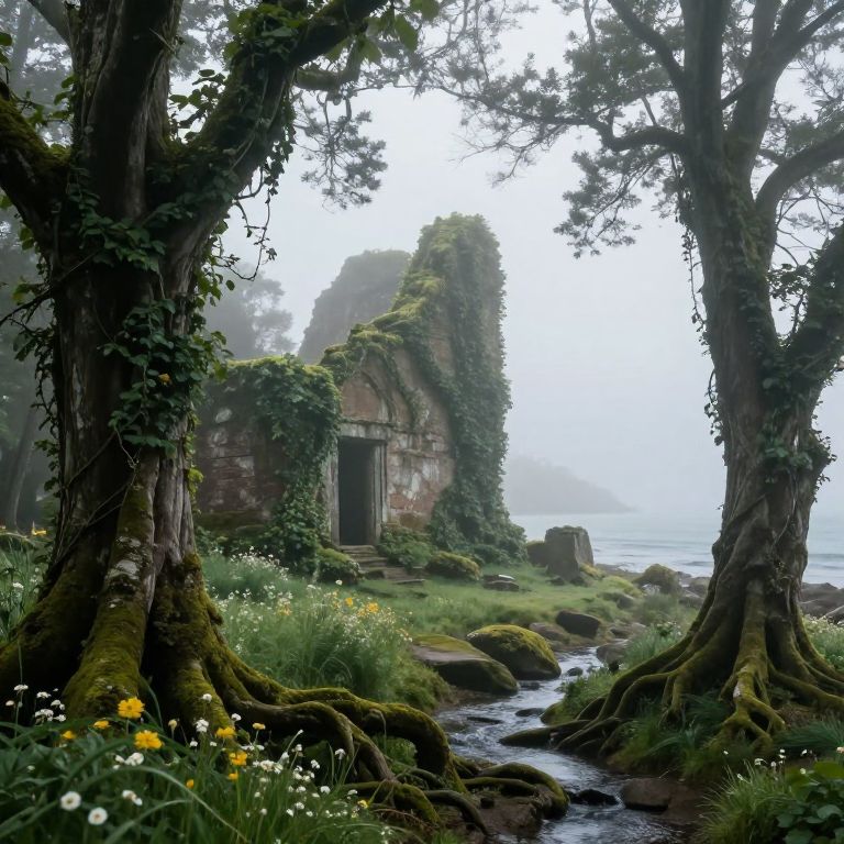 Isle shrouded in early morning mist, mysterious and ethereal, ancient ruins covered in vines, towering mossy trees with twisted roots, wildflowers dotting the forest floor, gentle streams flowing into the sea, creating a mystical and enchanting atmosphere.
