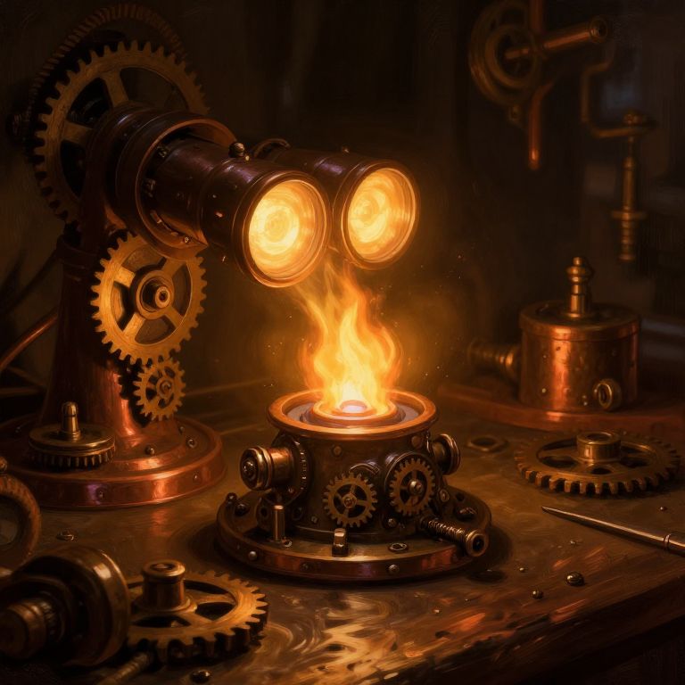 A photograph of a steampunk-inspired scene featuring a glowing, fiery metal burner with a bright flame at its center. Above the flame, two brass binoculars with illuminated orange lenses are mounted on a complex arrangement of interlocking gears and cogs. The background is dark, highlighting the warm, metallic hues of the machinery. The surface is reflective, showing the intricate details of the gears and metal components. The overall composition exudes a vintage, industrial aesthetic with a focus on mechanical intricacy and warm, glowing light.