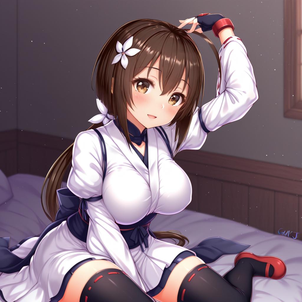 Musubi, sekirei, 1girl, brown eyes, brown hair, long hair, ahoge, ponytail, large breasts, fingerless gloves, thighhighs, by artist gmkj, dark_illustrious
