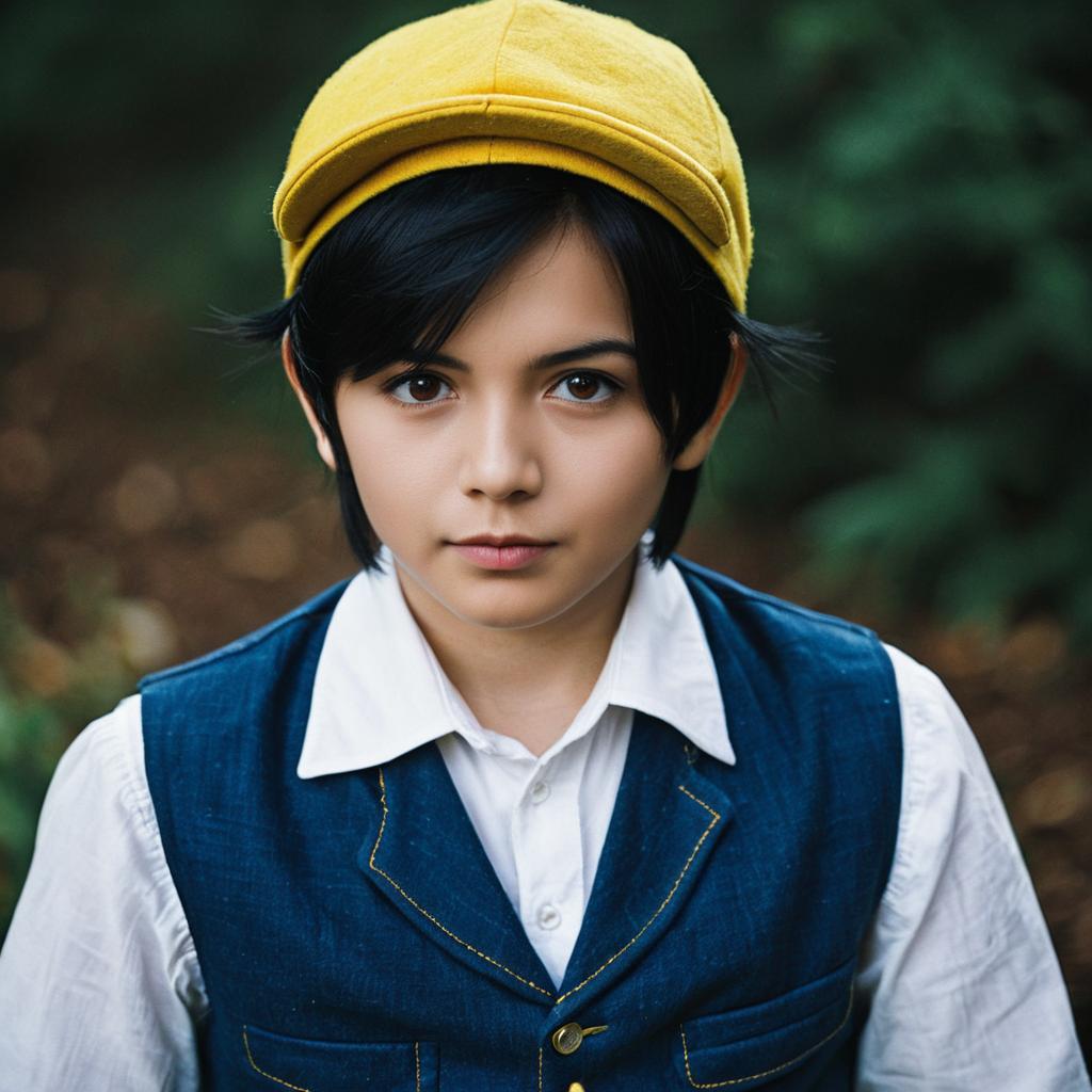 Boy in Pinocchio-Inspired Costume with Yellow Hat