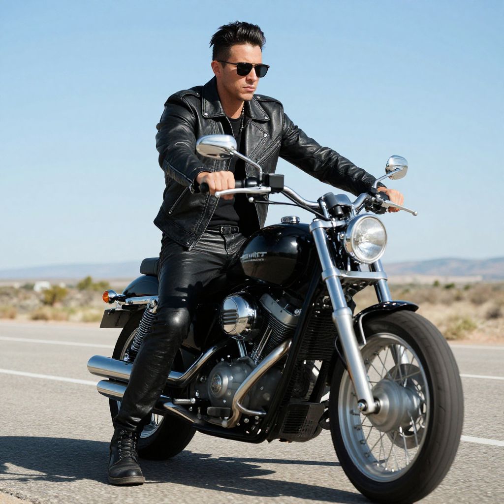 A stylish man rides a motorcycle down a deserted road, exuding an air of confidence and rebellion. Dressed in a sleek leather jacket and fitted pants, he embodies a modern take on the classic biker aesthetic, blending trashy and sassy vibes. The clear blue sky and open landscape enhance the adventurous spirit of the scene.