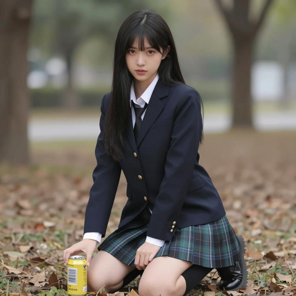 Asian woman with long black hair, kneeling on leaf-covered ground, wearing dark blue school uniform, green plaid skirt, white shirt, black tie, black shoes. Holding small yellow can in right hand. Background: blurred trees and light. CKS*JAPAN on right. Intense, direct gaze.