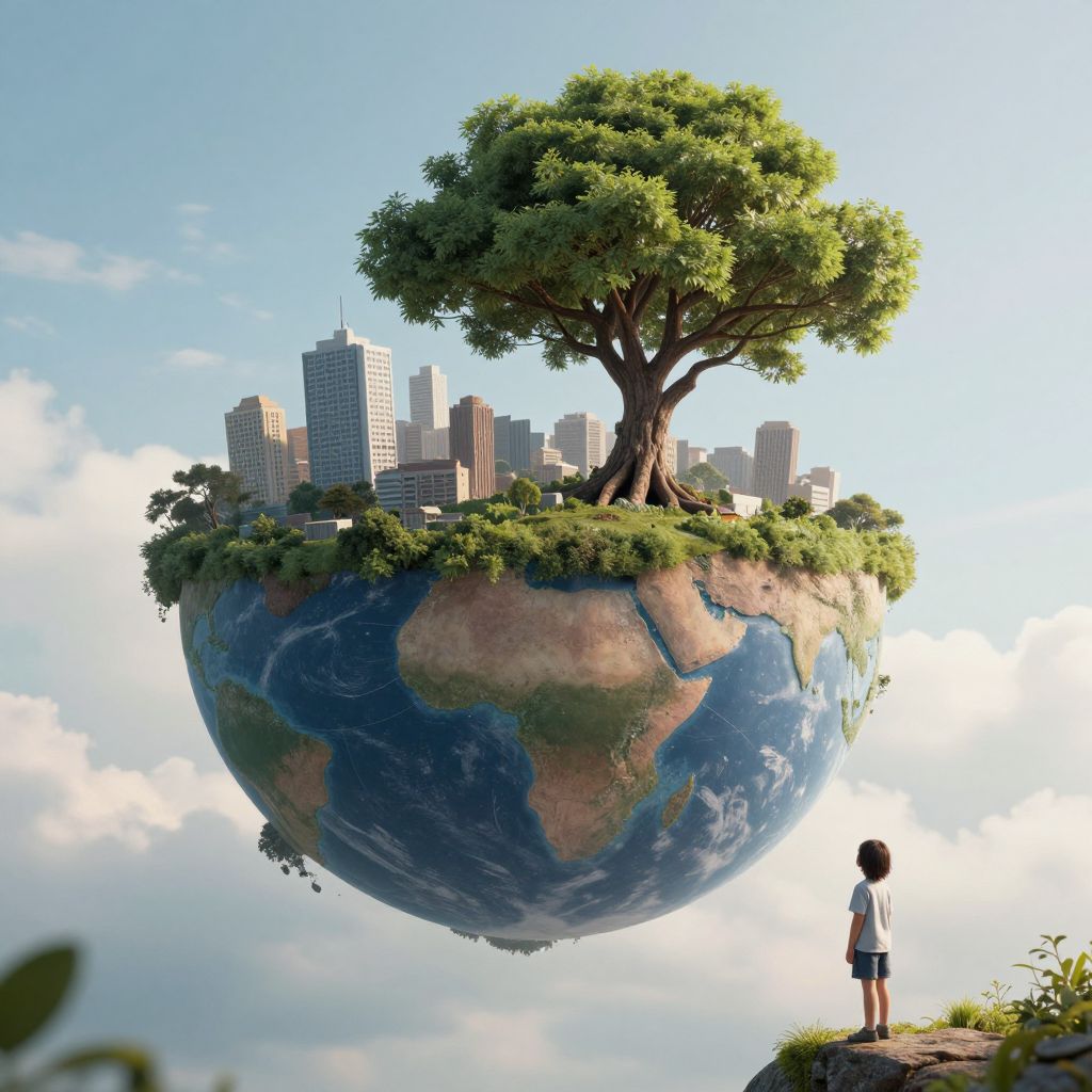 Suspended between earth and sky, a floating island cradles a cityscape and a solitary tree, symbolizing the delicate balance between dreams and reality, while a child below stands in quiet awe, embodying the innocence and wonder of boundless imagination.