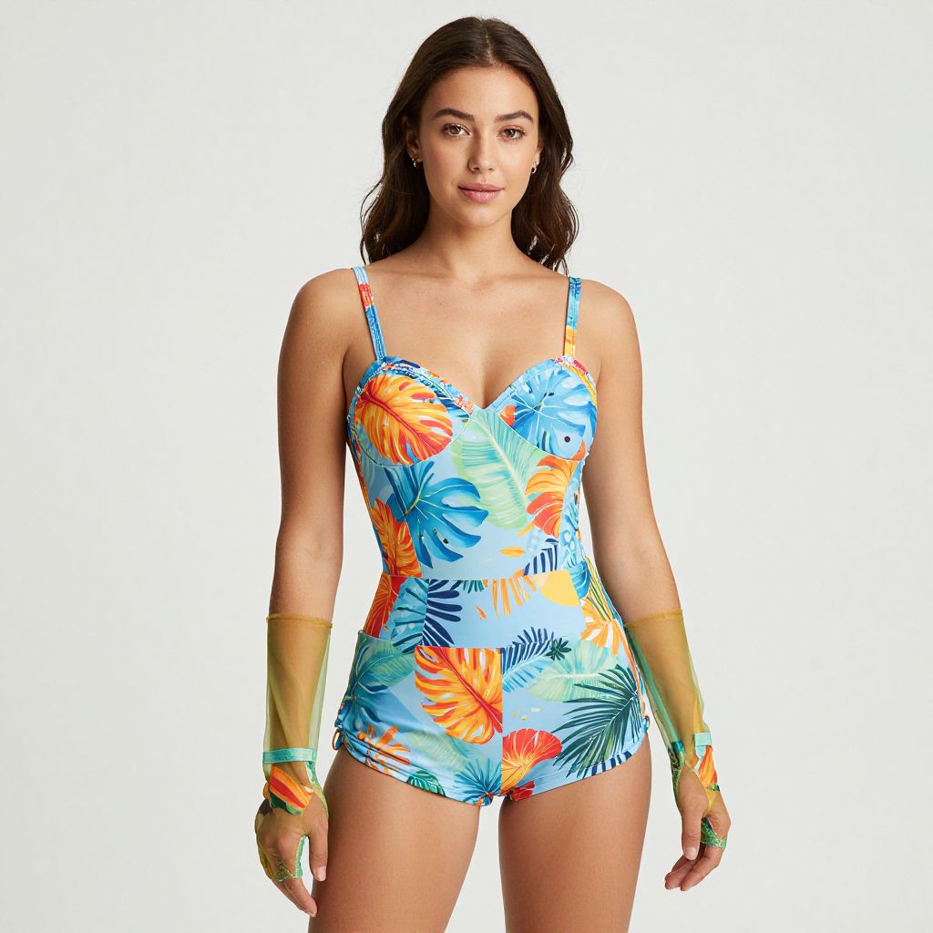 Full body shot, slim woman, vibrant swim romper, tropical print, lightweight breathable fabric, adjustable straps, fitted bodice, flared shorts, high waist, matching beach gloves, sheer mesh material, fingerless design, sun protection, playful colors, stylish and functional, perfect for summer beach day Sexy. Pretty face and beаutiful eyes. Big breasts