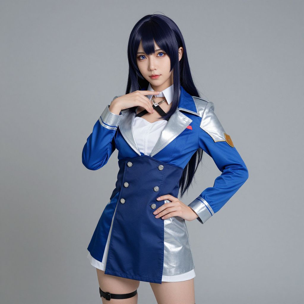 Kusanagi nene costume, woman in a blue and silver suit posing for a picture