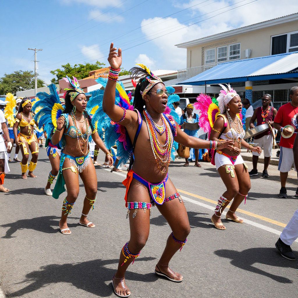 Trinidadian vibrant street festival scene, colorful costumes with feathers and beads, lively dancers in motion under bright Caribbean sun, festive atmosphere with steelpan musicians and tropical flowers, detailed and vivid style