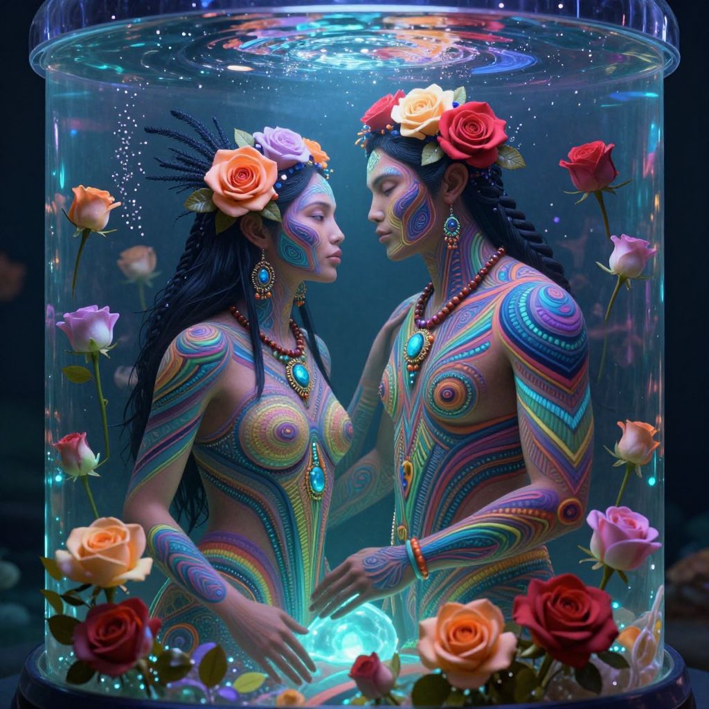 Photograph of two topless women with intricate, colorful body paint resembling tribal patterns, standing in a clear, cylindrical aquarium filled with water and floating roses. Both women have long, black dreadlocks adorned with orange and red flowers. They gaze into each other's eyes, their faces painted in matching designs. They wear beaded necklaces and earrings with turquoise stones. The water inside the tank glows blue, highlighting their painted bodies and the roses. The background is dark, emphasizing the vivid colors and the ethereal, almost magical atmosphere of the scene.