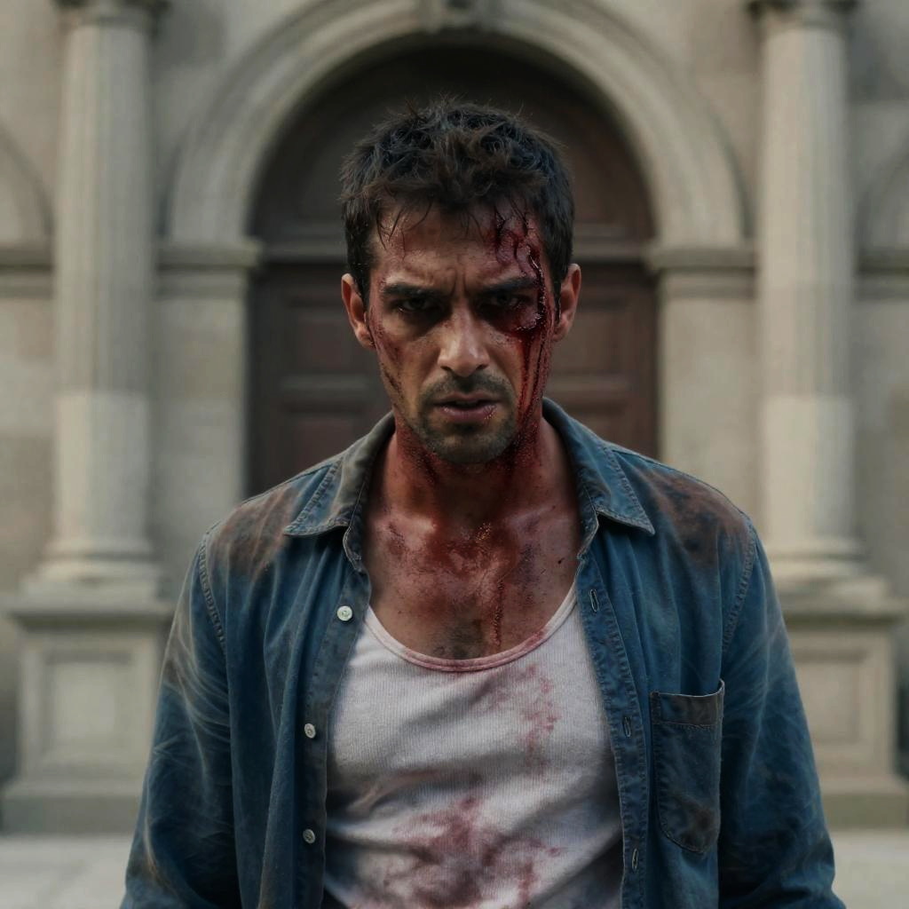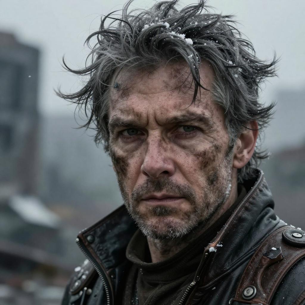 Photograph of a dirty, worried man with dark face smudges, wearing a gray beanie and denim jacket, looking back over his shoulder. Background: foggy, industrial-style building with arched windows and blurred machinery. Man's expression is intense and concerned.
