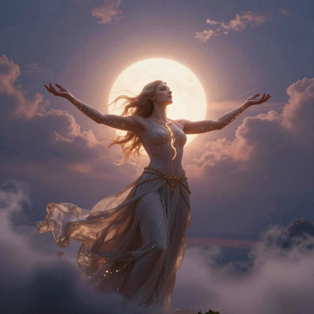 Seer of luminous horizon realms, enchantment flows through whispered winds, in digital fantasy realism, standing with arms outstretched toward sky, with glowing tattoos winding along arms, soft glowing mists and twilight hues