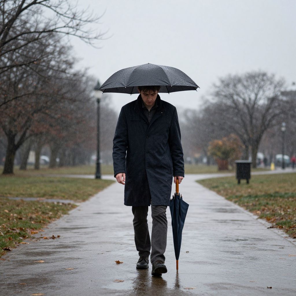 Side Part Ivy League, fit European man, walking through a historic college campus, autumn leaves falling around him, natural light, realistic photography style