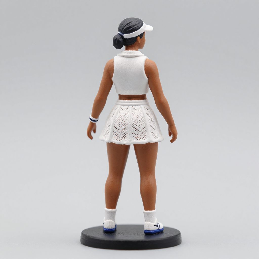 Photograph of a female tennis figurine facing away, wearing a white crop top, white lace skirt, white socks, black shoes, black visor