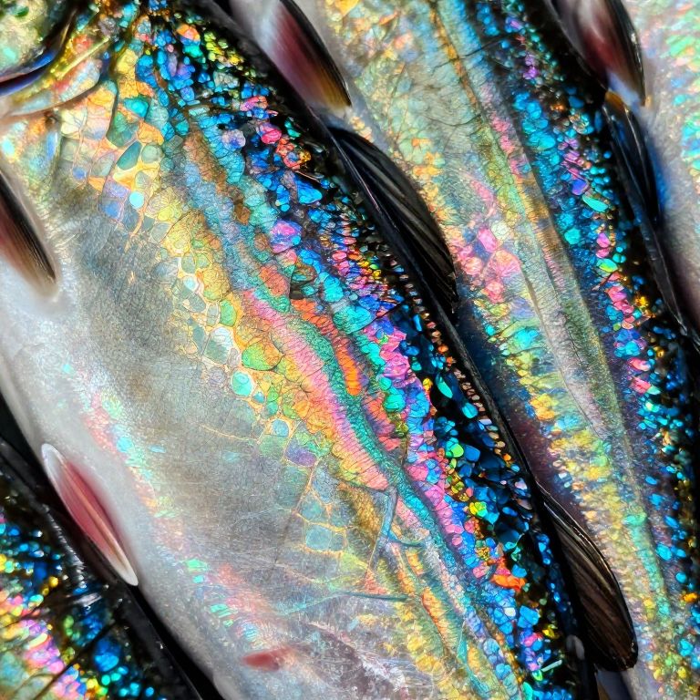Close-up of Fische scales shimmering with iridescent colors, abstract macro perspective highlighting texture and patterns, artistic lighting creating a surreal and captivating visual effect