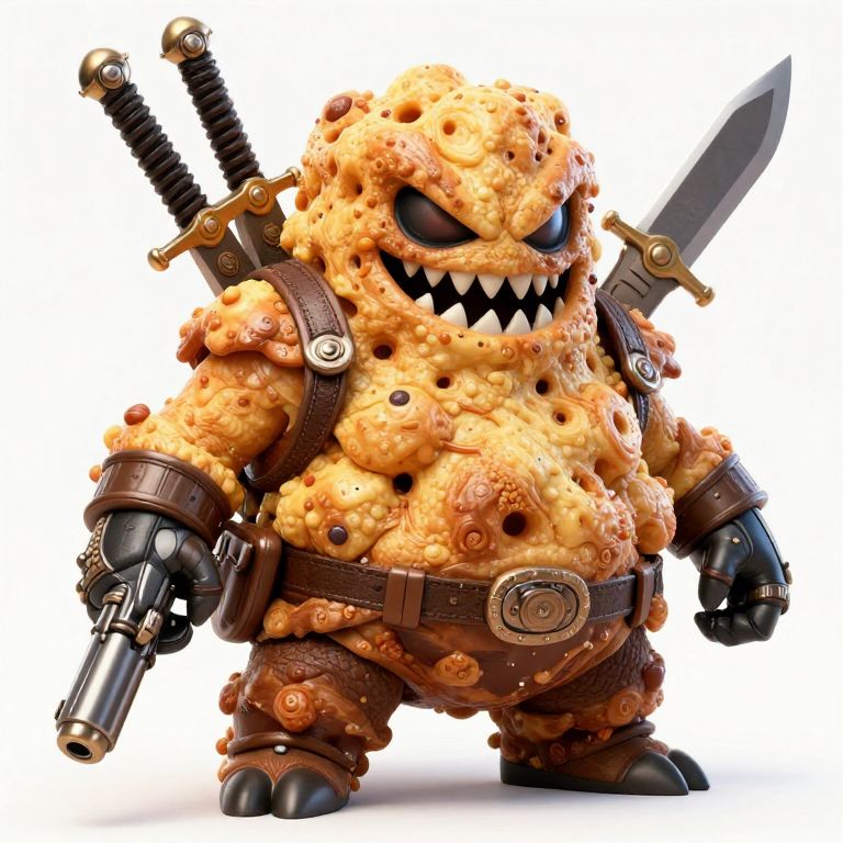 A digital CGI illustration of a small, menacing creature with a rocky, orange, pockmarked body resembling a sponge. It has a sharp-toothed, black, triangular mouth, and glowing blue eyes. The creature wears brown, leather-like armor with metal bracers and a belt, and holds a large, silver gun in its right hand and a large sword with a black handle in its back. The background is pure white, making the creature the sole focus. The style is highly detailed with a mix of steampunk and fantasy elements, emphasizing a rugged, battle-ready appearance.
