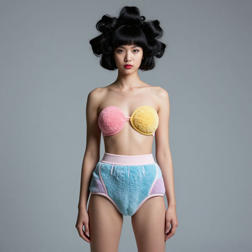 Hair diaper, avant-garde fashion editorial, model with hair creatively styled and sculpted into a diaper-like garment, bold colors, studio lighting, futuristic and high-fashion vibe, detailed textures