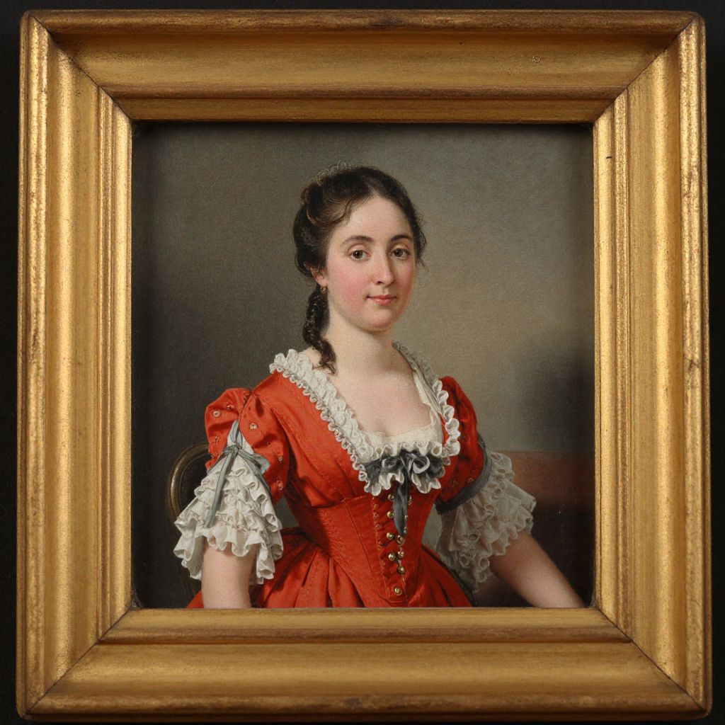 A finely detailed 19th-century miniature portrait encased in a gold frame, depicting a woman adorned in a red dress with white ruffled trim, showcasing the elegance and craftsmanship typical of the period.