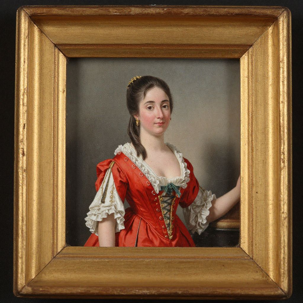 18th-century oil painting of a fair-skinned woman with dark hair, wearing a red corseted dress with white lace, framed in a gold