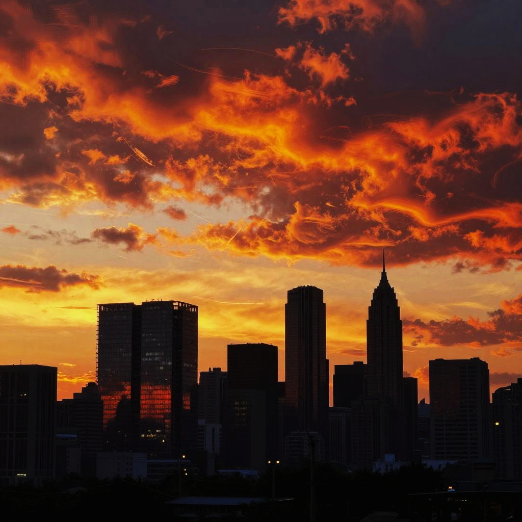Album cover sunset showing a city skyline silhouette at dusk, vibrant fiery sky with exaggerated reds and yellows, light reflections on glass skyscrapers, dynamic composition with abstract brush strokes, energetic and dramatic ambiance
