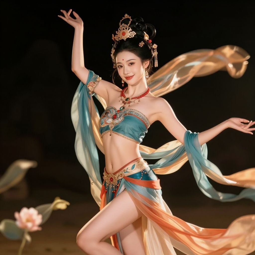 (goddess-like happiness, flirtatious, seductive:1.4), (RAW photo:1.2), (photorealistic:1.6), (masterpiece:1.3), (intricate details:1.2), (detailed face:1.2), dramatic, ray tracing, fashion photograph, fFaceDetail, cowboy shot, good hands, Sharp focus, cinematic lighting, dunhuang, Chinese Dunhuang Flying Fairy, floating clothes, floating flower, pov legs, thighs, dunhuang cloths, hanfu, waist cape, strapless, navel, robe, (1girl, solo, outdoors, night time, dancing:1.6), confident smile, beautful face, (large breasts, narrow waist:1.2), sexy body, perfect body, shiny hairs, hair ornament, earrings, necklace, jewelry, confident, showcasing, buzzing atmosphere
