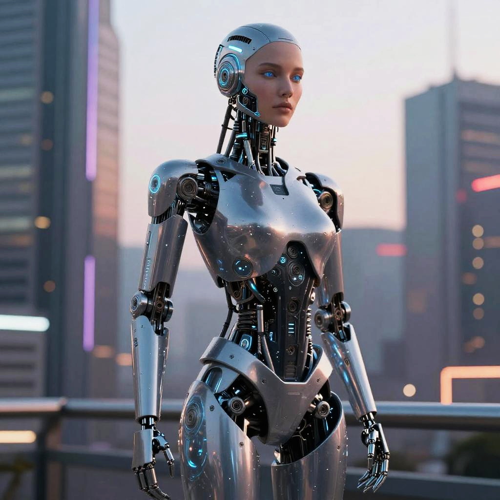 Humanoid female robot art, futuristic sleek design with metallic and glass textures, standing in a high-tech neon cityscape at dusk, intricate mechanical details on face and limbs, soft glowing blue lights, cyberpunk atmosphere, digital art