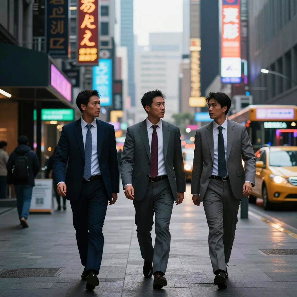 Three men in suits in a dark alley, dramatic noir lighting, rain-soaked streets, intense mood, hyper realistic, cinematic composition