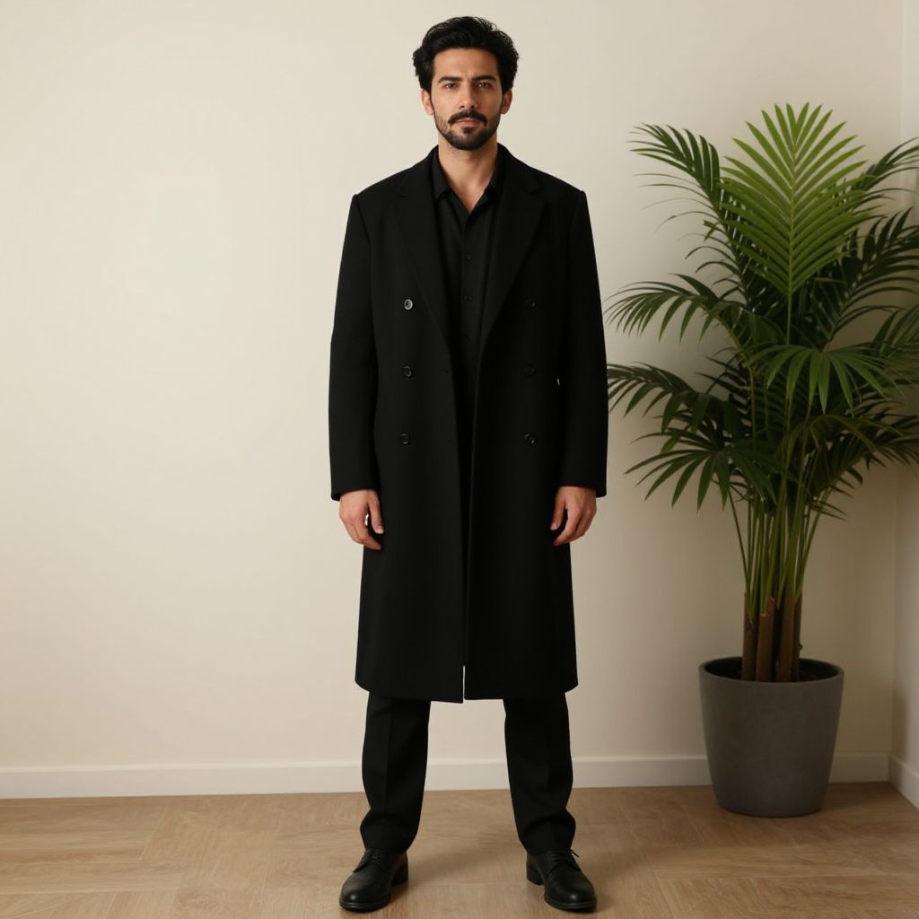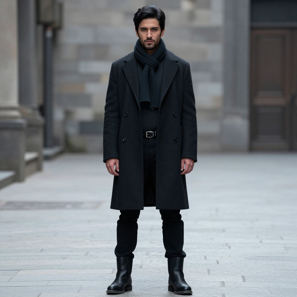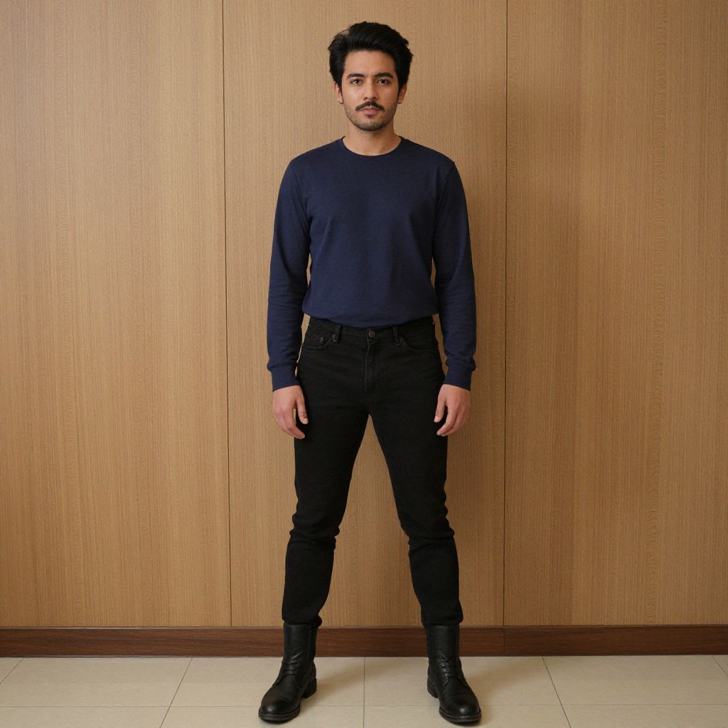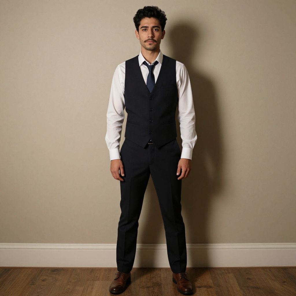 "eri costume, 1boy, solo, male focus, black hair, indoors, standing, facial hair, boots, full body, long sleeves, mustache Realistic photo of casual sexy person with pretty face"