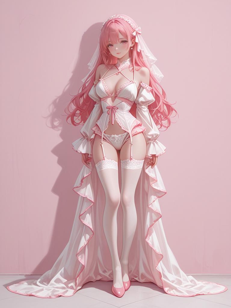 1girl, realistic face, full body shot, Woman, boudoir lingerie, sheer lace halter-style bralette in ivory with pink trim, plunging neckline, scalloped edges, coordinating lace panties, low-rise with pink trim and bow detail, minimalist aesthetic, studio background in pastel pink.