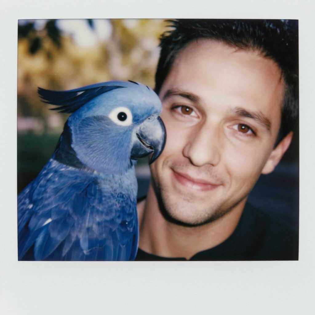 Photograph of a smiling young man with short dark hair and fair skin, closely positioned next to a blue parrot with a black beak. Bl