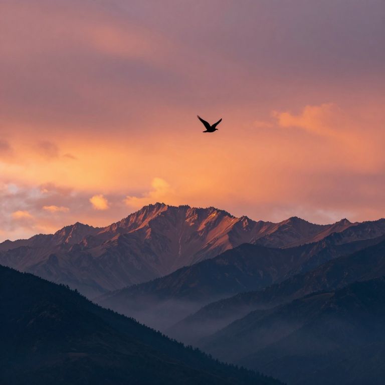 Sunset bathes majestic mountain peaks in vibrant hues of orange and pink, as silhouetted birds soar gracefully against a backdrop of layered clouds and misty valleys below.