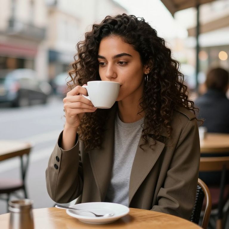 Photograph of a curly-haired woman with olive skin, wearing a gray top and brown blazer, sipping from a white cup at an outdoor café