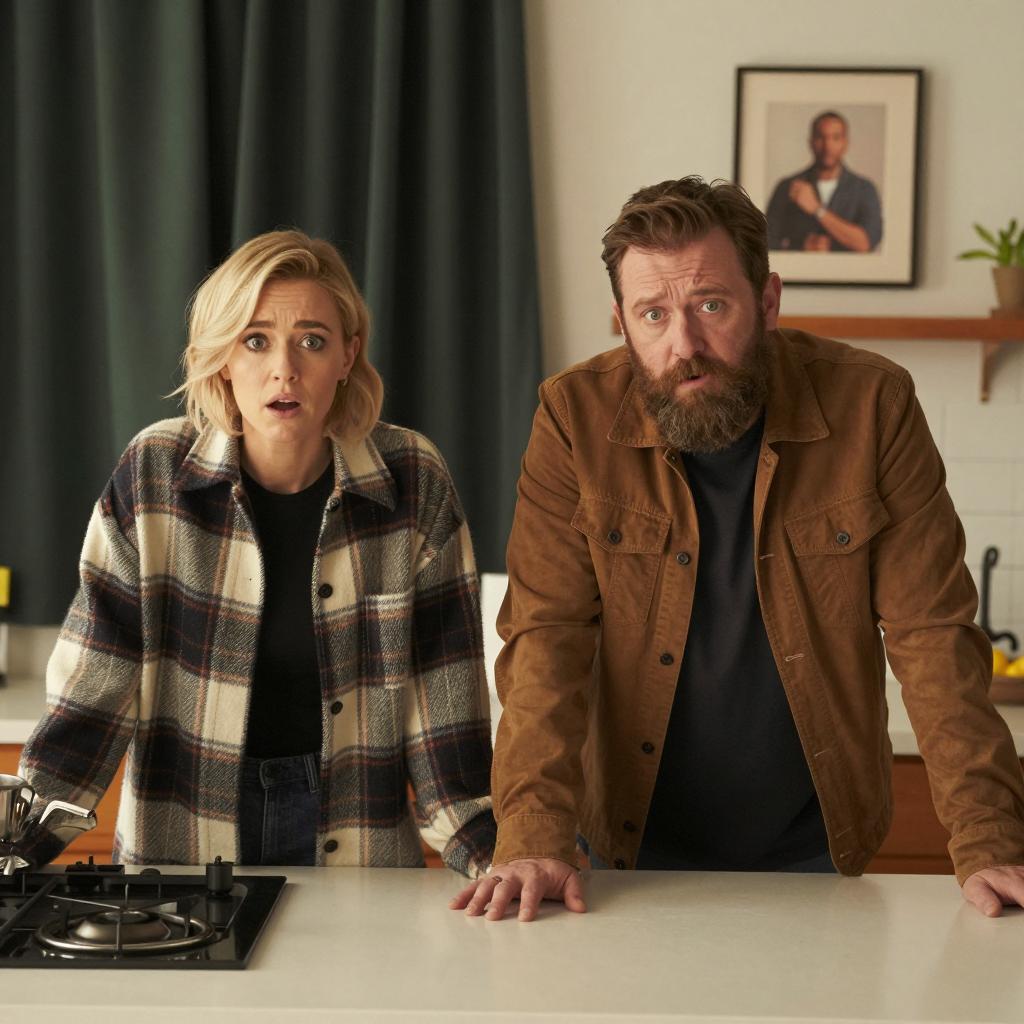 Photograph of two people standing beside a car. The man on the left, wearing a black beanie, jacket, and jeans, has a beard and is looking forward with his hands raised. The woman on the right, with large afro hair, wears a black leather coat and purple shirt, shouting with her right hand raised. Car with partial license plate visible on the left. Daytime, road in background.
