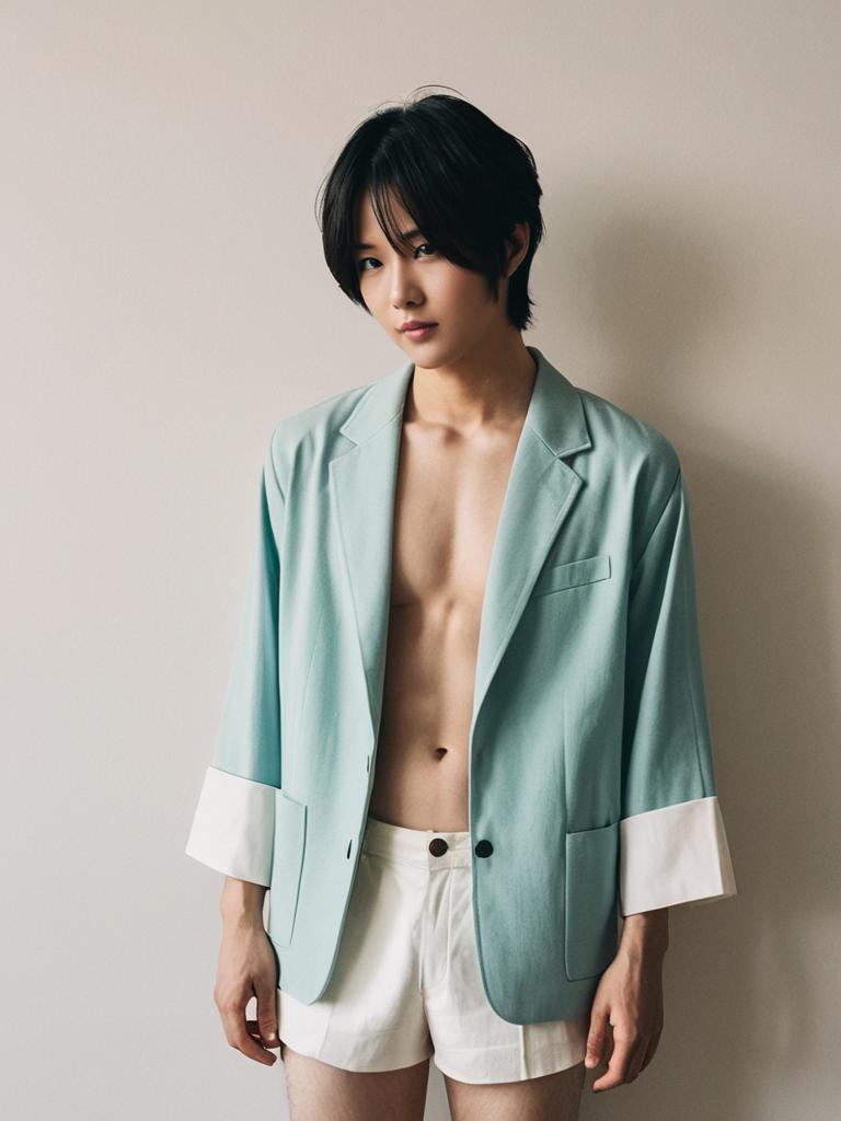 Portrait of a young man with silver hair cosplaying as Tsunagu Hakamata aka Best Jeanist. He is wearing a dark blue denim jacket over his bare torso and light blue denim jeans. The photo is taken indoors with soft neutral background lighting.