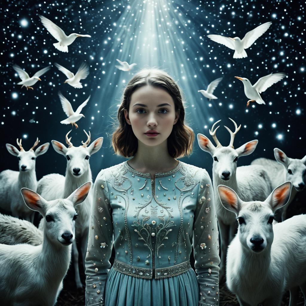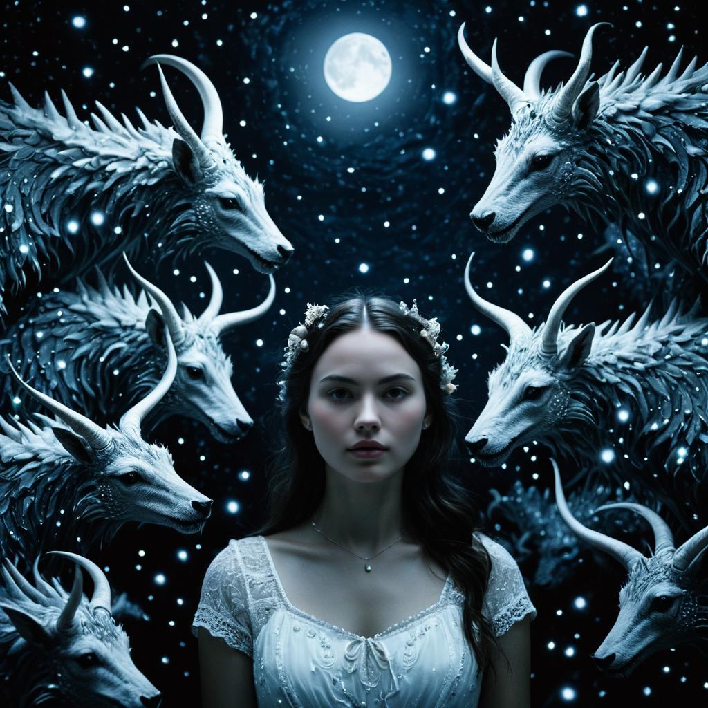 Ethereal Night Girl Surrounded by Glowing Beasts