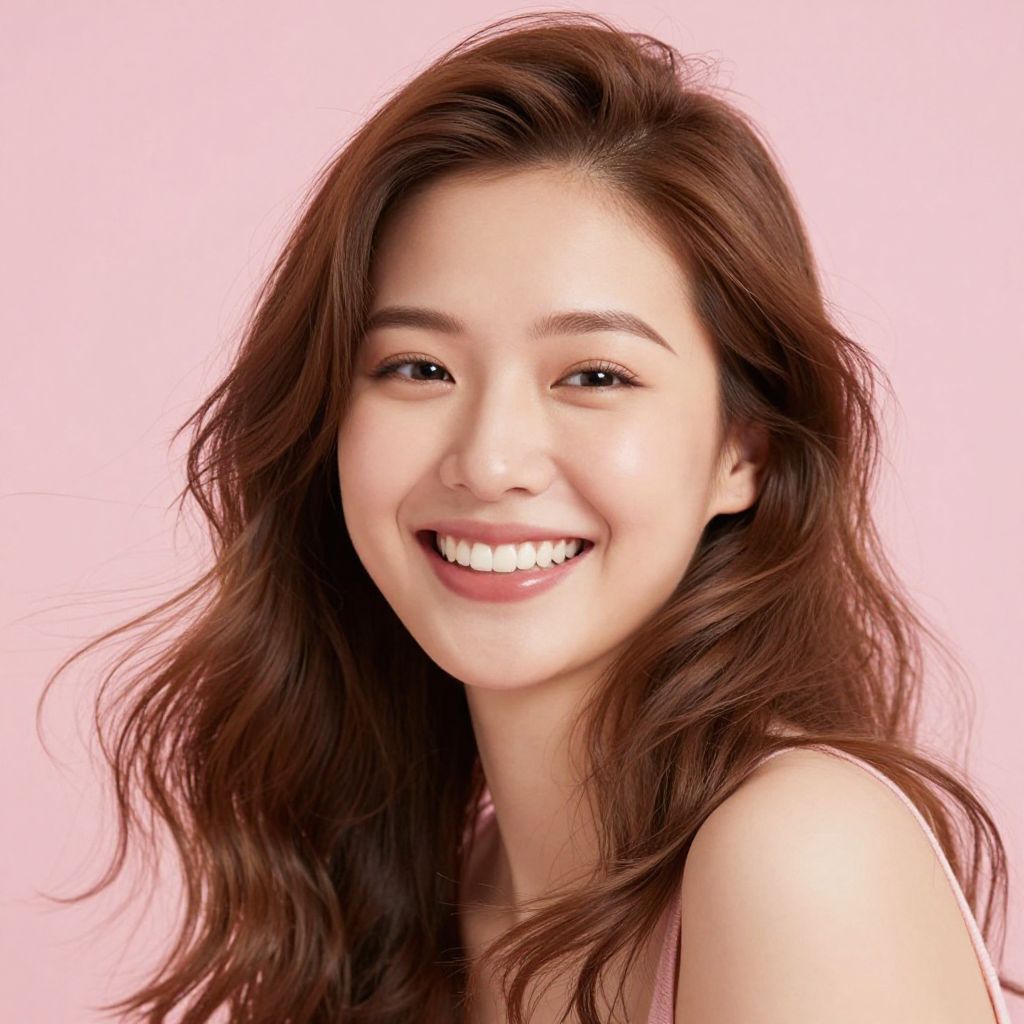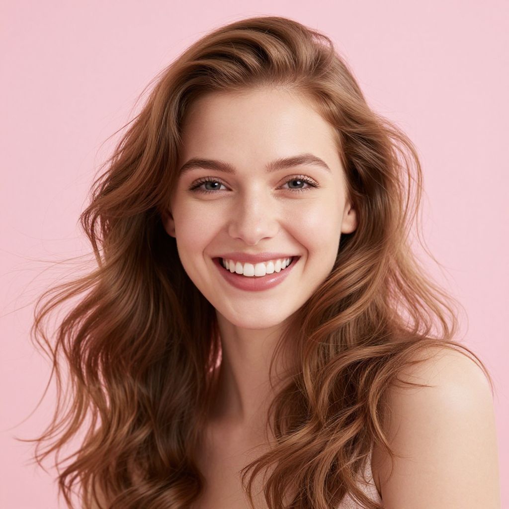 Radiant joy and warmth emanate from a woman's smile, her light brown hair cascading like a gentle breeze against a soft pink backdrop, evoking a sense of timeless serenity and boundless optimism.
