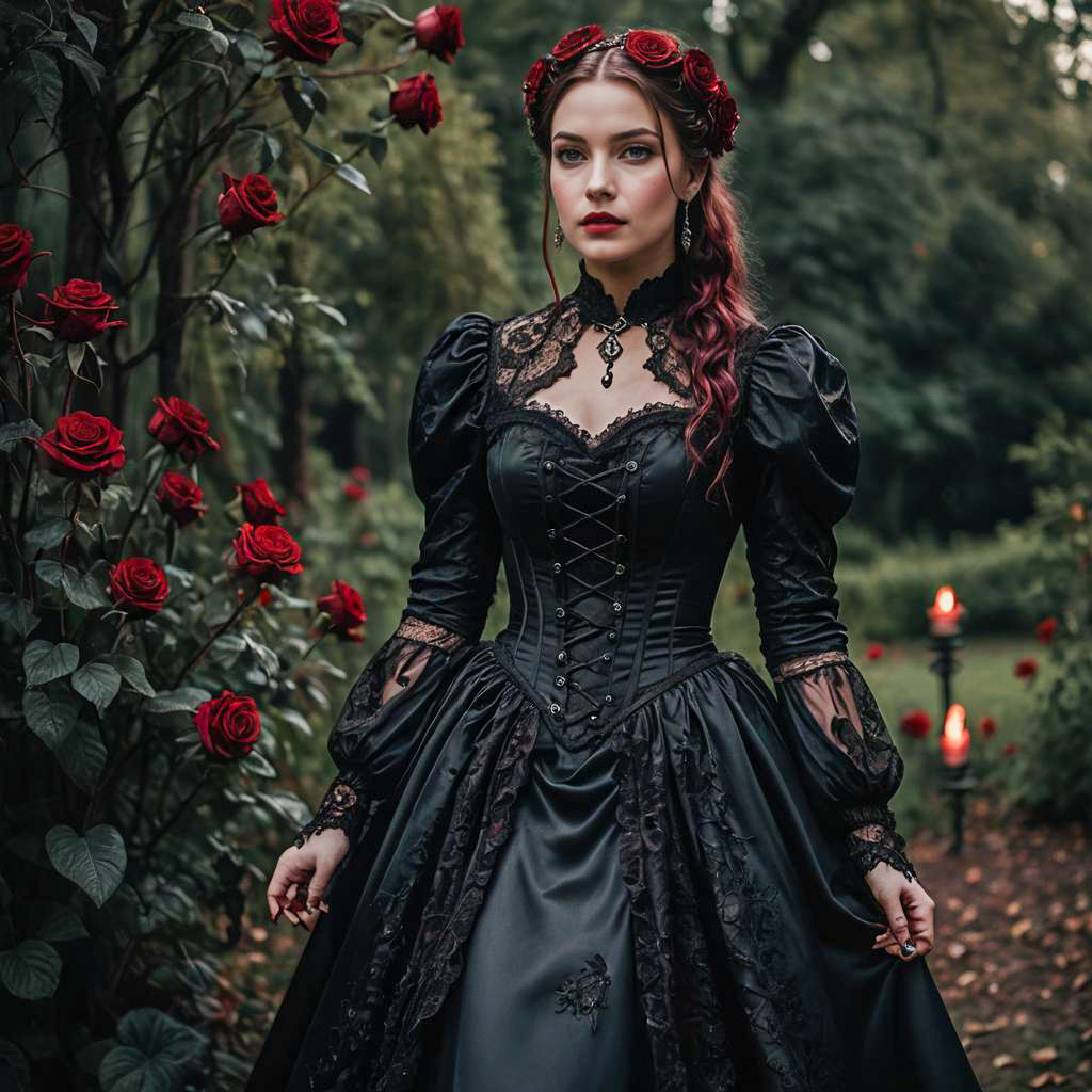 Woman in Black Corset in Enchanted Garden