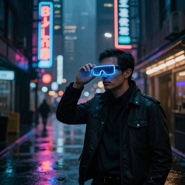 Detectie of hidden signals in a cyberpunk cityscape, neon signs and dark alleys, a detective with augmented reality glasses scanning the environment, rain-soaked streets reflecting colorful lights, moody and atmospheric, detailed and vibrant visuals.