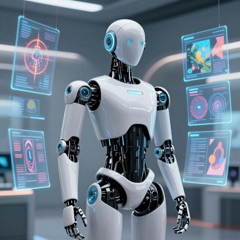 Photograph of a sleek, white humanoid robot with blue glowing eyes and joints, standing in a futuristic, brightly lit room. The robot's metallic body contrasts with its glossy, white exterior. Surrounding the robot are five floating, neon-blue holographic screens displaying various digital interfaces, including icons and data graphics. The background features sleek, gray walls with soft, ambient lighting. The overall scene exudes a high-tech, sci-fi atmosphere, emphasizing advanced technology and digital interfaces.