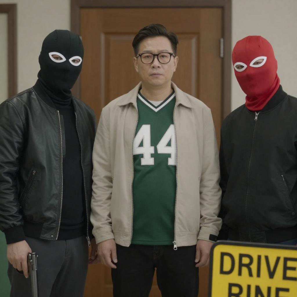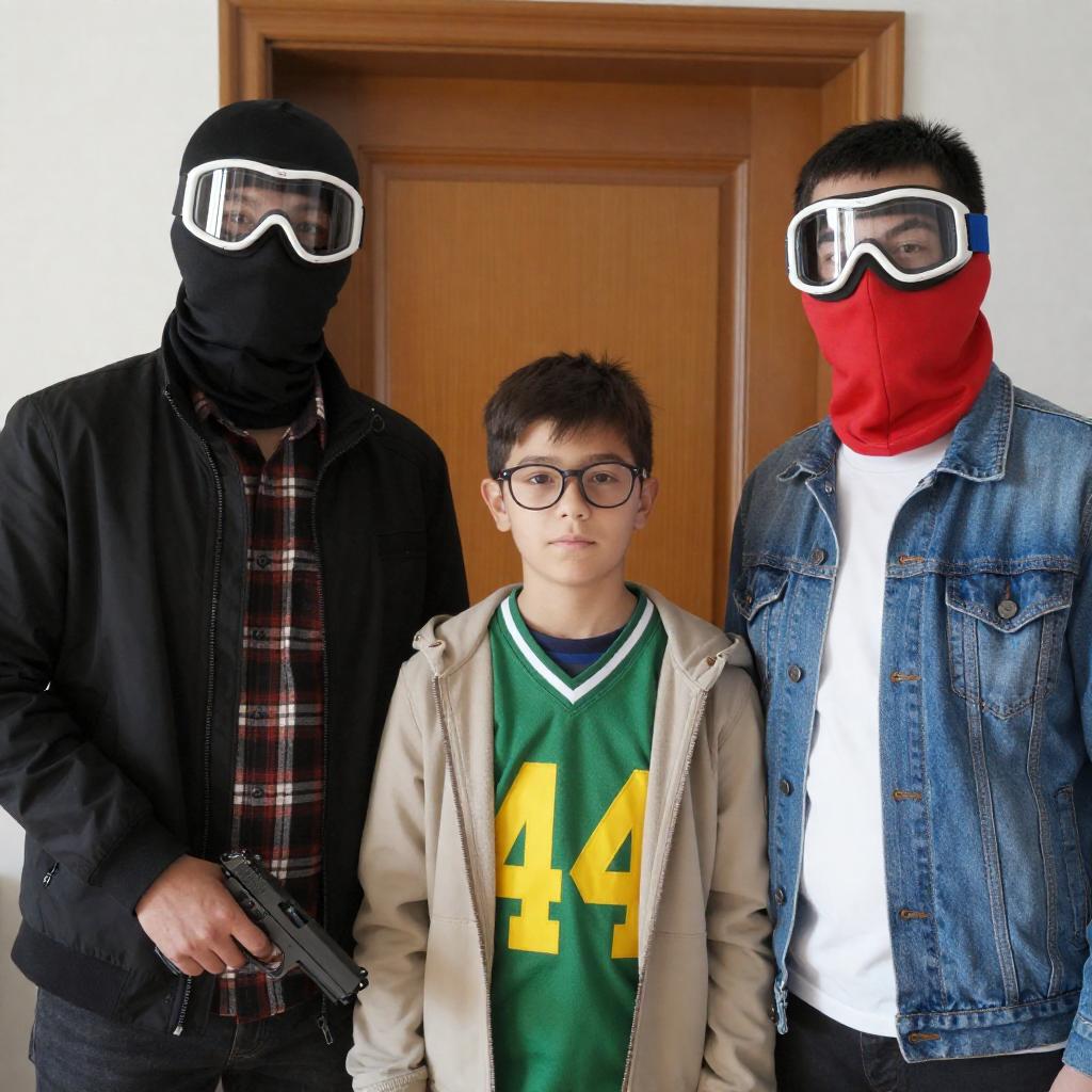 A photograph of three people standing indoors. On the left, a man wearing a black ski mask with white goggles, a black jacket, and a plaid shirt holds a small handgun in his right hand. His expression is neutral. In the center, a young boy with short brown hair and glasses wears a green shirt with yellow numbers "44" and a beige jacket. His expression is neutral. On the right, another man wears a red ski mask with white and blue accents, a blue denim jacket, and a white shirt. He has a neutral expression. The background features a wooden door with a