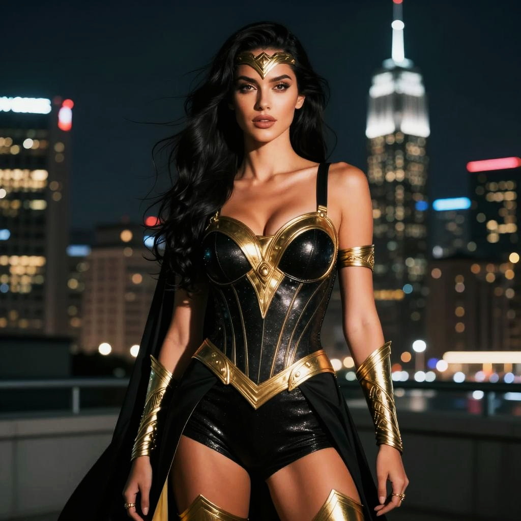 This striking image features a woman in an elaborate black and gold costume, reminiscent of superhero aesthetics. Set against a stunning city skyline at night, the intricate detailing of her outfit combines glamour with a powerful presence, evoking a sense of fantasy and adventure.