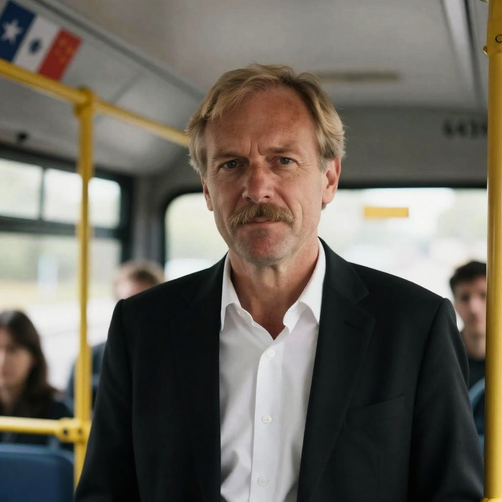 Middle-aged white man with thinning blonde hair, small mustache, and slightly furrowed brows. Wearing black blazer and white shirt. Standing inside a bus, with overhead storage and flags visible. Background is blurred with bus interior elements. Neutral expression. Bus has number 6439 on the top right.
