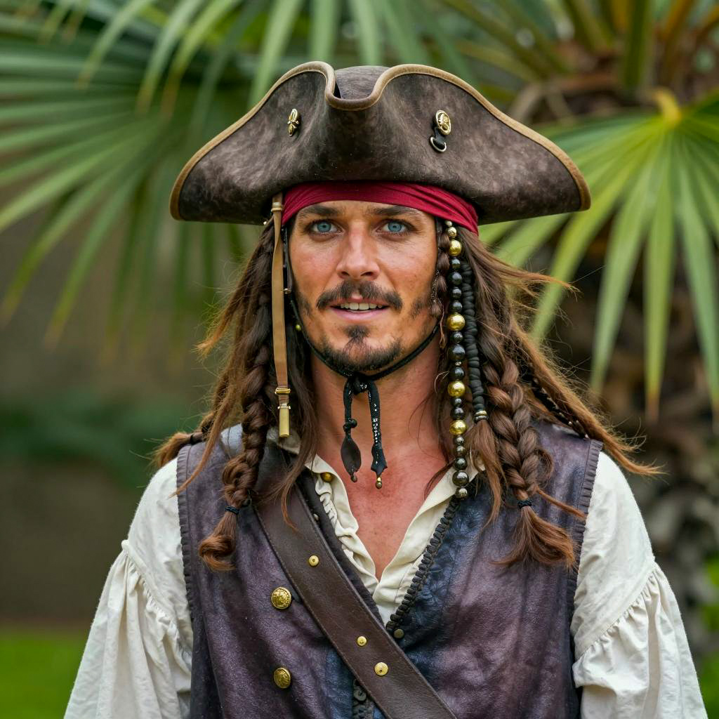 Medium close-up portrait of a man dressed as a pirate wearing a large brown tricorn hat with a red headband, long brown braided hair adorned with gold beads, a white ruffled shirt, and a dark brown vest with gold buttons. He has blue eyes and a slight smile, set against an outdoor background with greenery and palm leaves under natural light.
