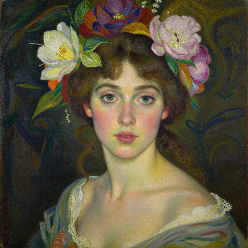 A beautifully detailed oil painting of a woman adorned with flowers, featuring intricate details, high key lighting, and dramatic volumetric lighting, reminiscent of the works of Egon Schiele and Erin Hanson.