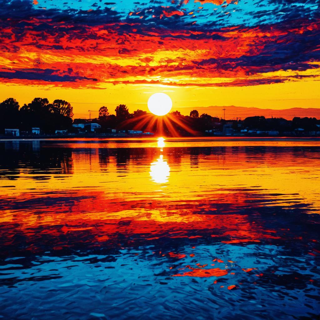 Vibrant abstract digital artwork of sunset reflections, dazzling colors, dynamic composition, post-impressionism, vibrant, vivid tones, professional lighting