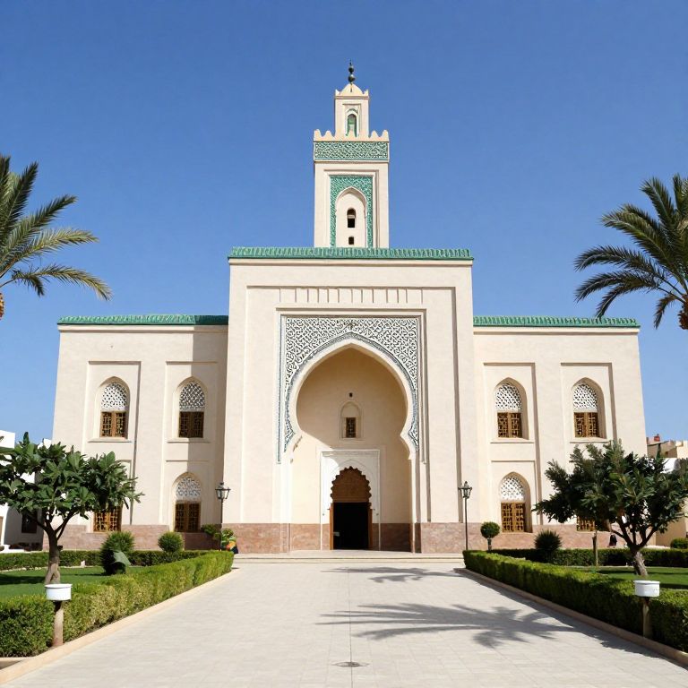 Imposing mosque facade in Chenini, southern Tunisia, featuring a central arched entrance adorned with intricate geometric patterns, flanked by symmetrical windows and crowned by a tall minaret, set against a clear blue sky and surrounded by manicured gardens and palm trees.