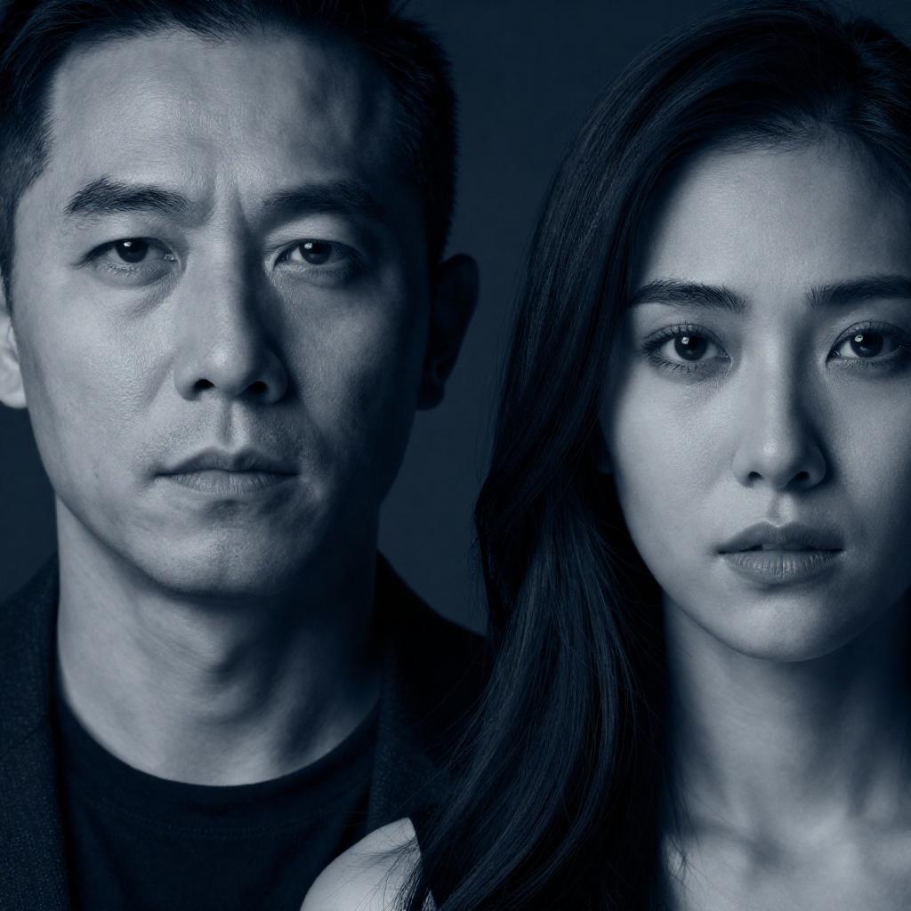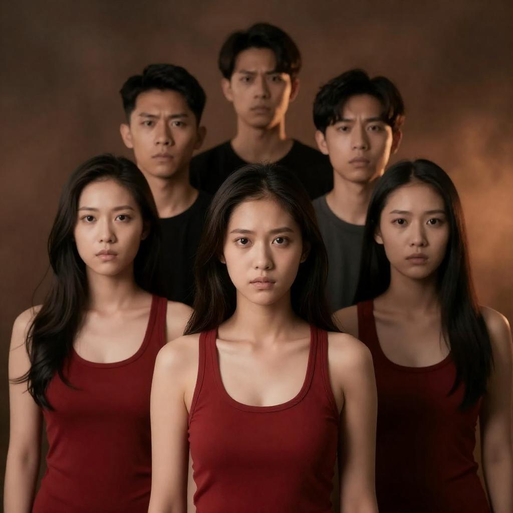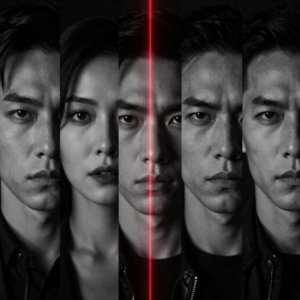 Photorealistic movie poster with five vertical, close-up portraits of intense faces. Bright red laser beam cuts through central face. Dark, shadowy background. Four men, one woman. Strong, focused expressions. Black and white color scheme with dramatic lighting.