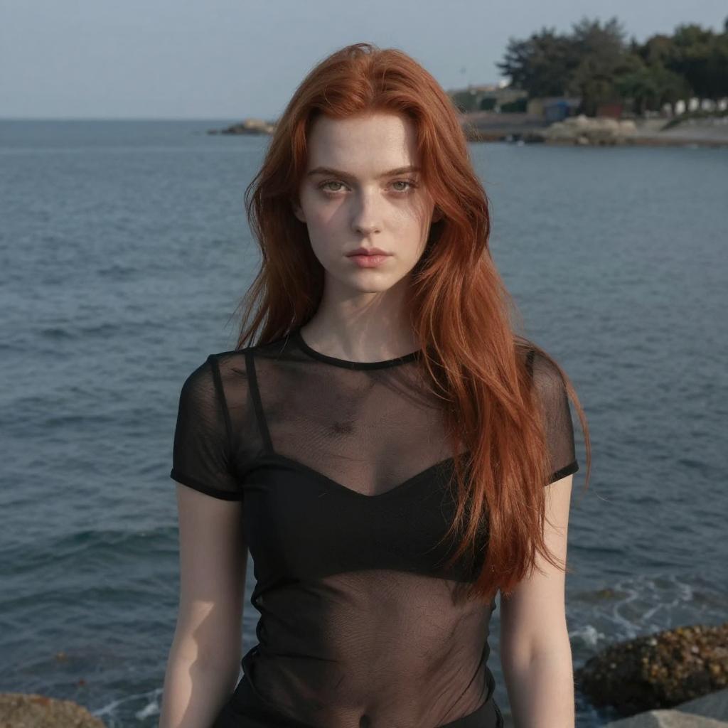 Photograph of a young woman with long, straight, red hair standing in front of a calm, dark blue sea. She's wearing a sheer, black, short-sleeve top with subtle texture and black trim. Her expression is serious and focused. The background shows a distant shoreline with blurry trees and rocks. The overall color palette is cool and muted, with the sea dominating the scene.
