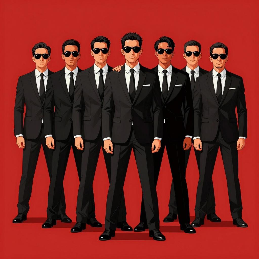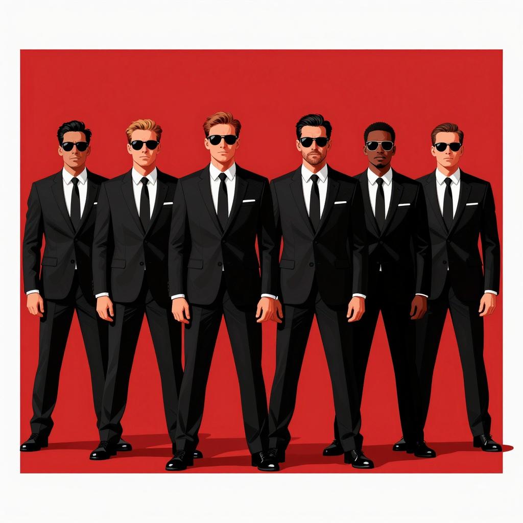 Illustration of six men standing in a row against a red background. They wear black suits, white shirts, black ties, black dress shoes, and dark sunglasses. All men have serious expressions and stand with their arms relaxed at their sides. The image uses a strong red and black color scheme.