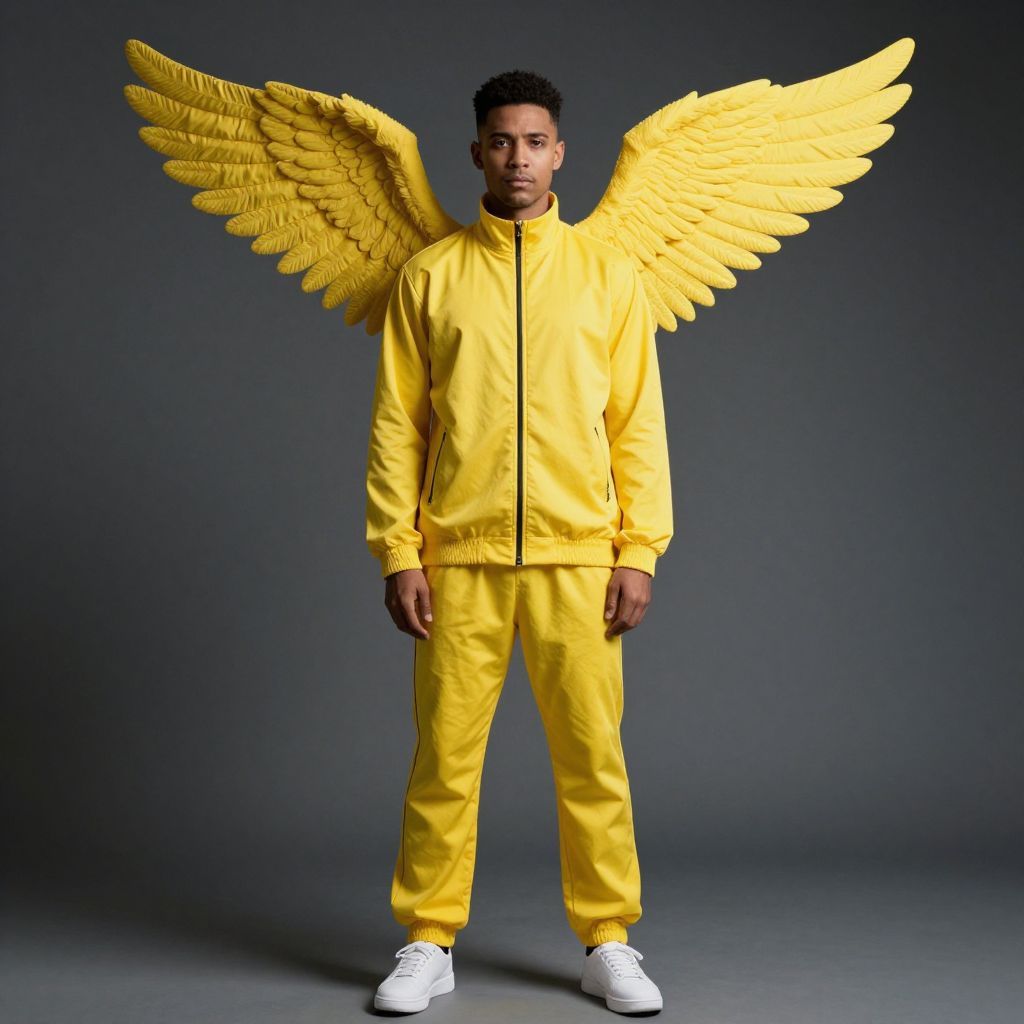 Photograph of a Black man with yellow angel wings, wearing a yellow tracksuit and white sneakers, standing against a dark gray background.