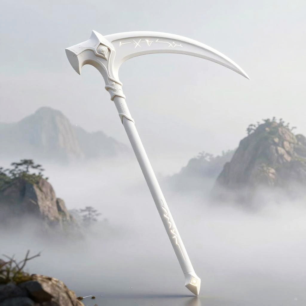 Scythe concept art featuring a rustic, ancient weapon with weathered wooden handle, jagged iron blade covered in moss, set in a mystical forest at twilight.