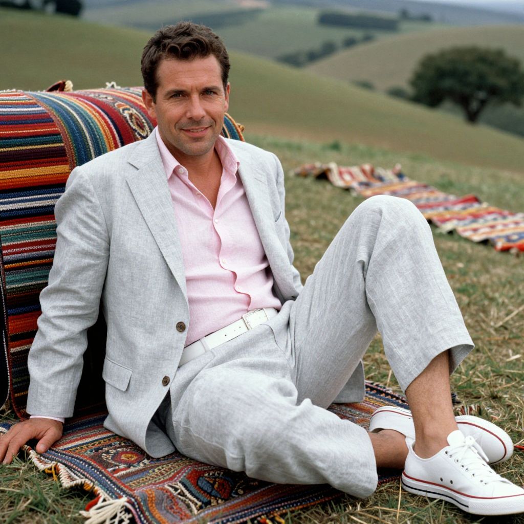 A man, light gray linen suit, pastel pink open collar shirt, white canvas sneakers, minimalist white belt, rolling hills, colorful woven textiles, 3M analog film stock, relaxed smile, enjoying the casual outing. Man has masculine face and piercing eyes